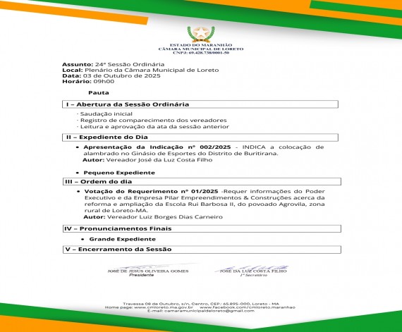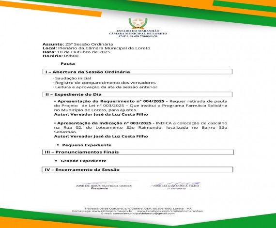25ª Sessão Ordinária da Câmara Municipal de Loreto